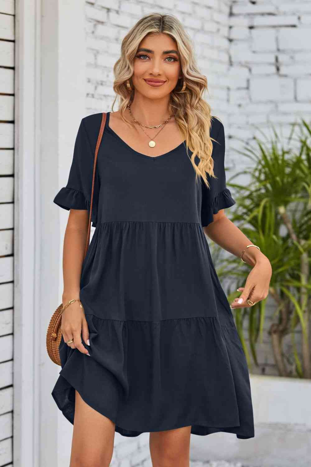 Distressed Collared Neck Flounce Sleeve Denim Dress