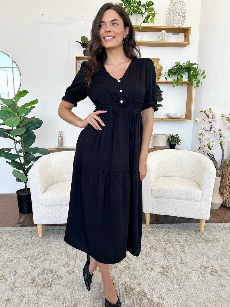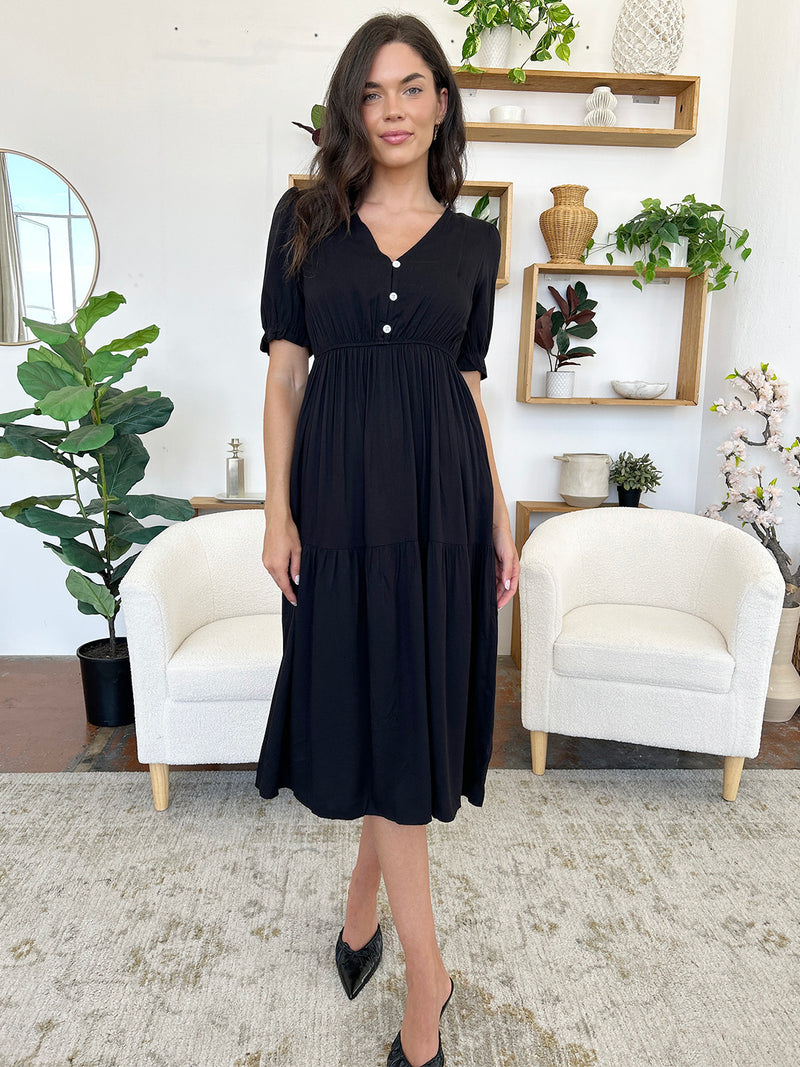 Ruched V-Neck Half Sleeve Midi Dress