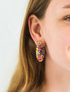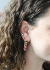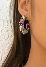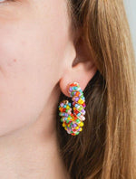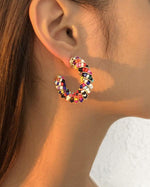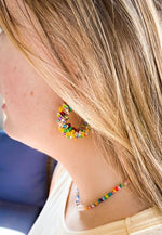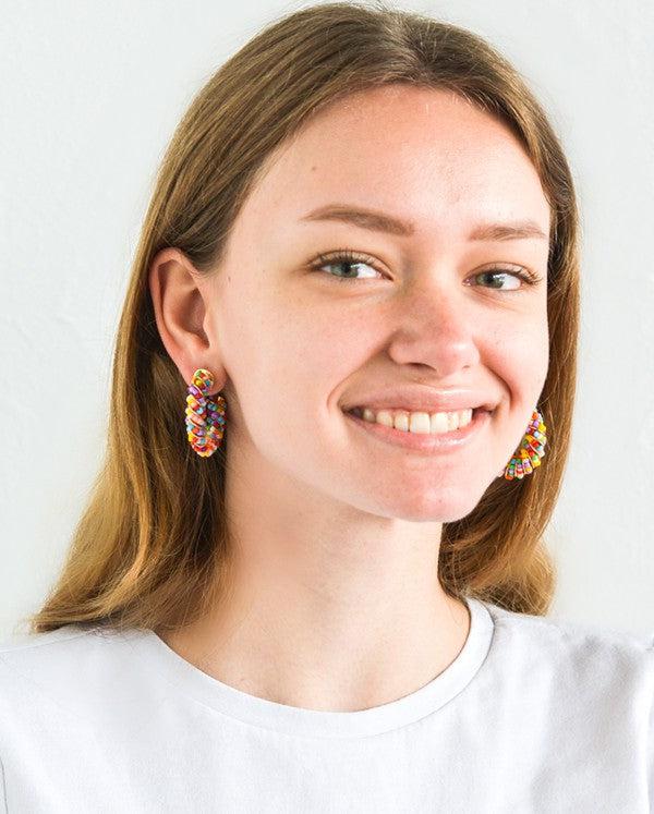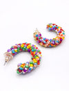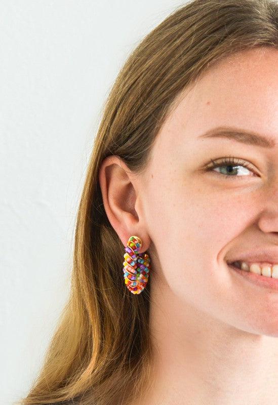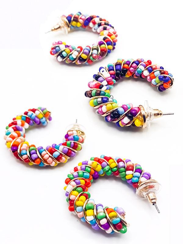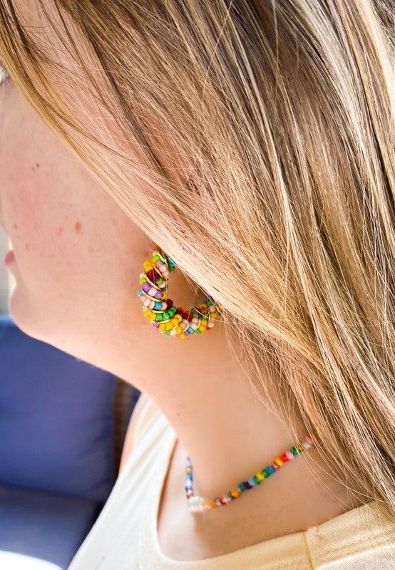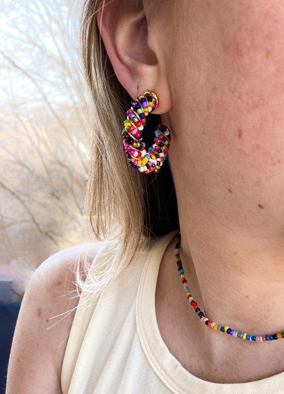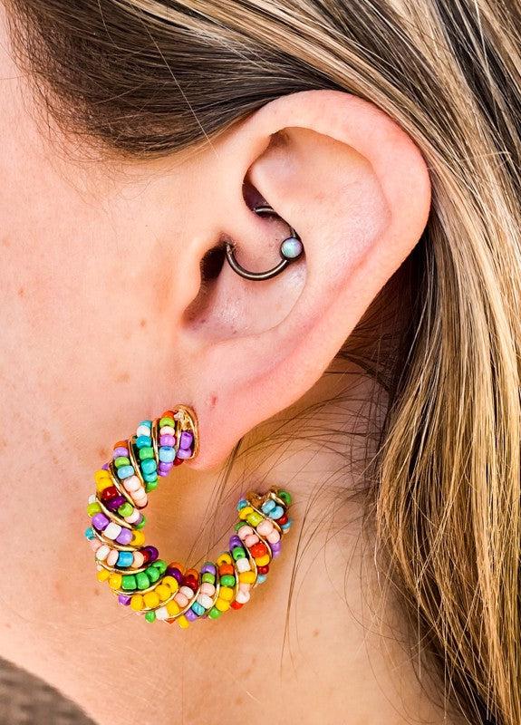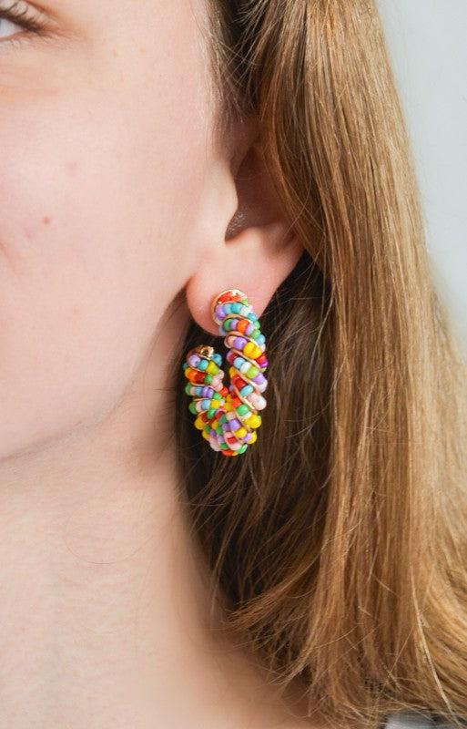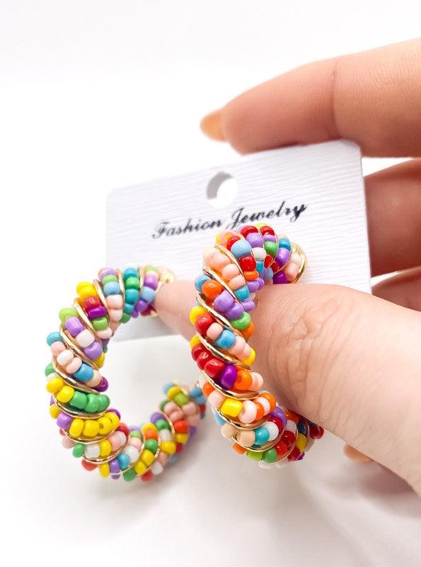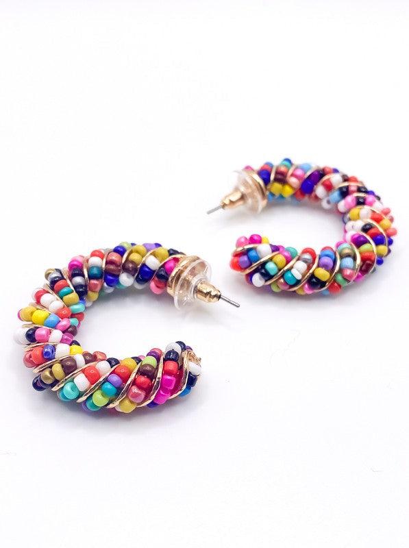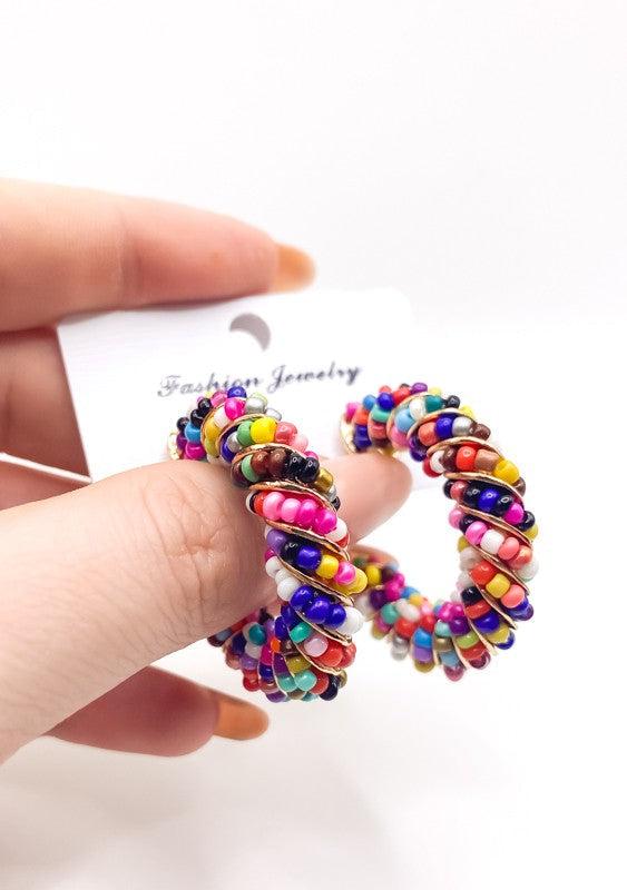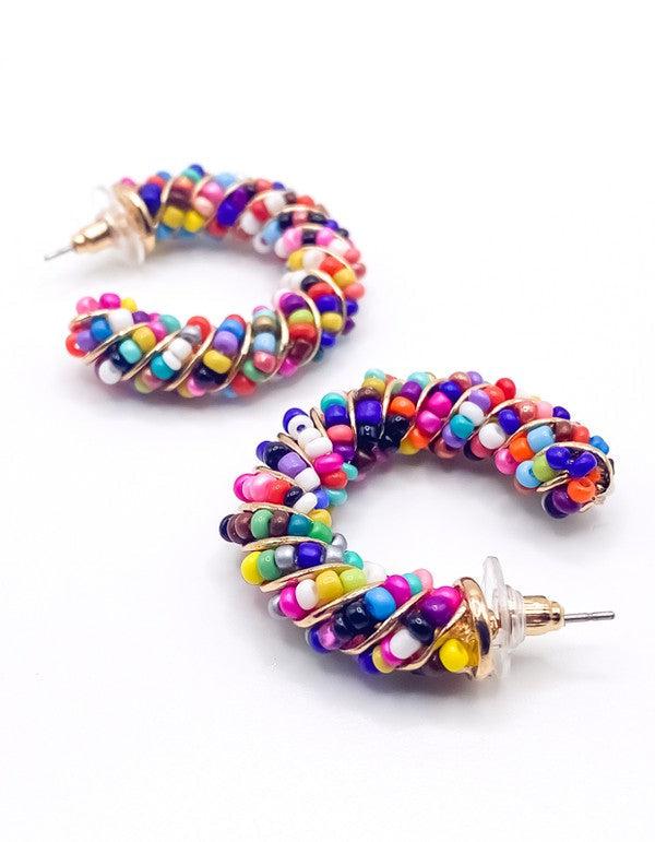 Cheers to bold colors and modern designs being brought to life on the most timeless of shapes - the hoop.  Pair with a little black dress or a tee and jeans.  These hoops demand attention.  The beaded statement hoops have multi colored seed beads wrapped in a gold spiral design.  The beaded statement hoop earrings have post backs. In two colors:  rainbow and sunset.