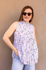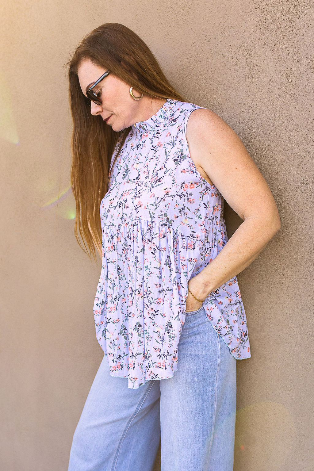 This flowy floral print sleeveless tunic top is made of a super soft rayon material. Relaxed and flowy fit, has a ruffle detail at neck that gives a femenine touch to this top This floral top will be the perfect addition to your every day wardrobe during summer time. It will be the perfect to go top for an everyday look to night time. It is long enough that you can tuck it in to shorts or any pants of your choice.