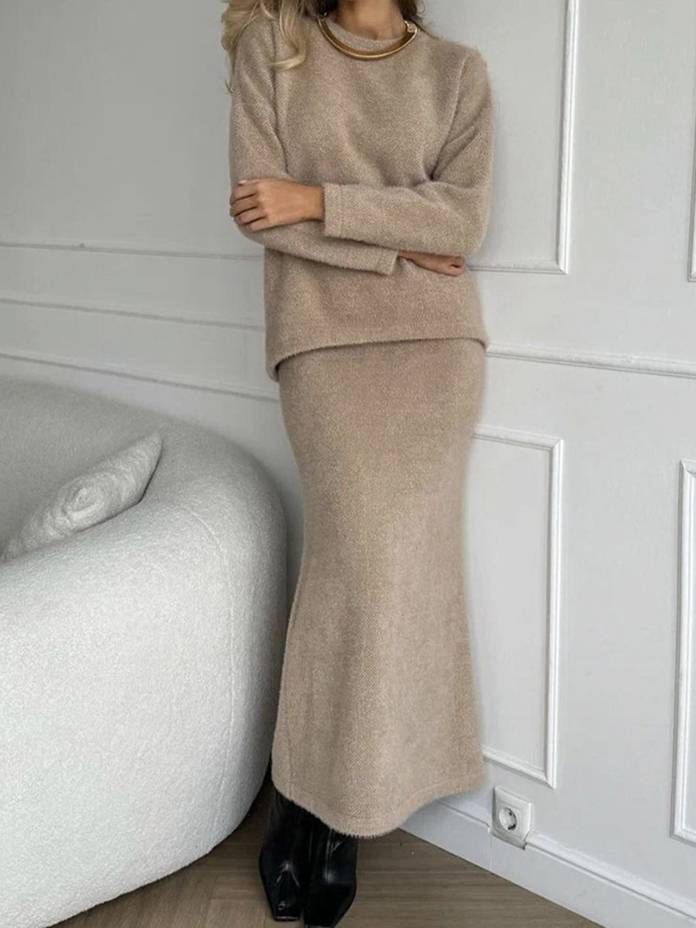 Round Neck Dropped Shoulder Top and Midi Skirt Sweater Set