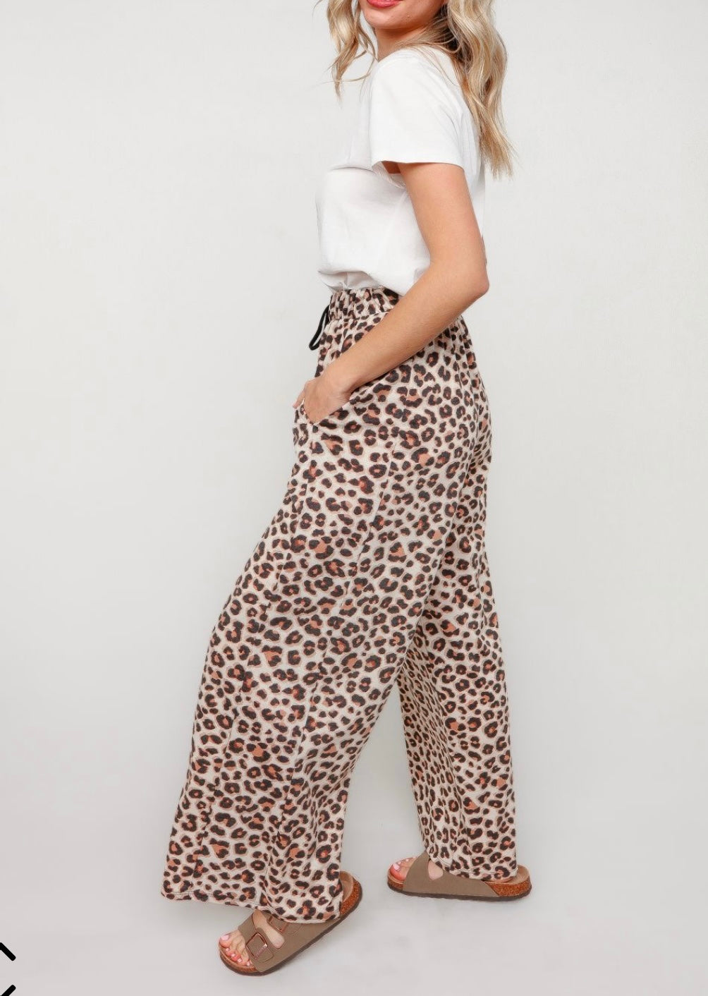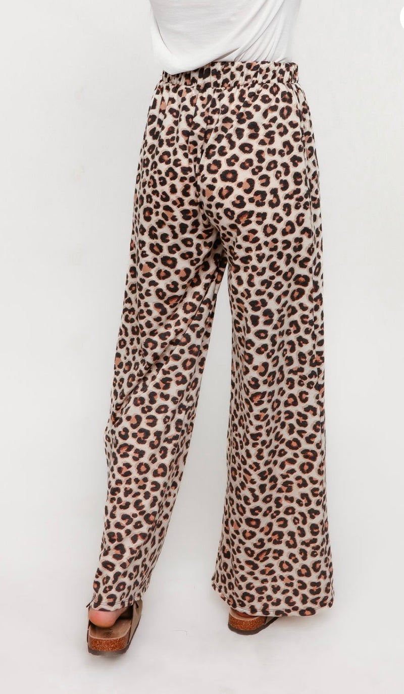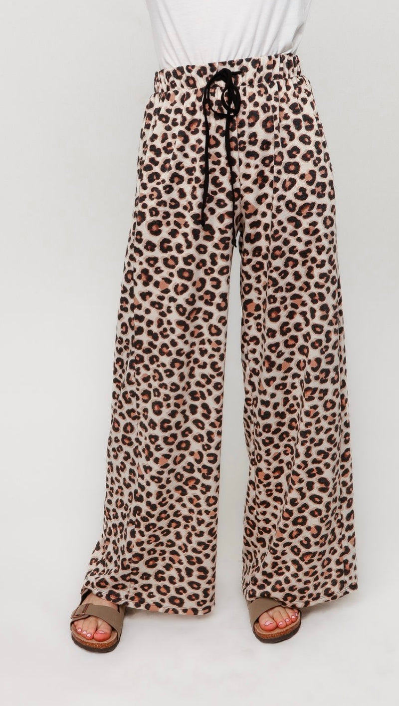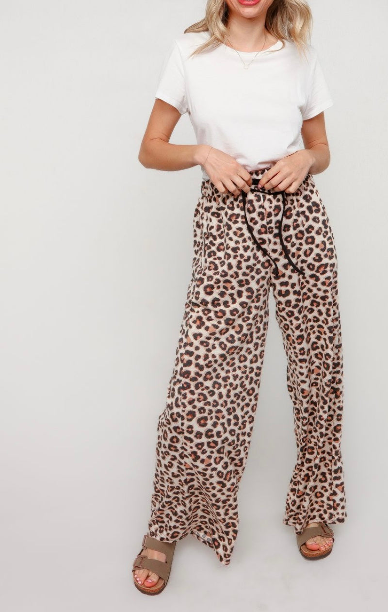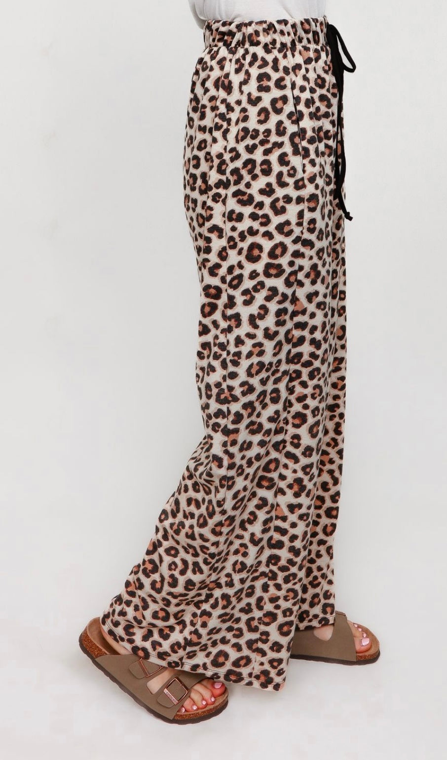 Easy leopard pants have an elastic waist with a decorative drawstring.  Fabric is soft, stretchy and has a comfortable ease.  Style these gorgeous pants with a black vest, tank or tee.  Perfect for travel.