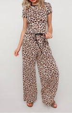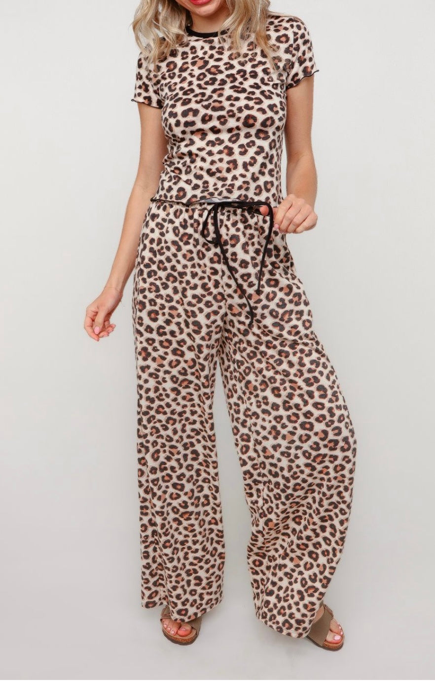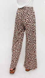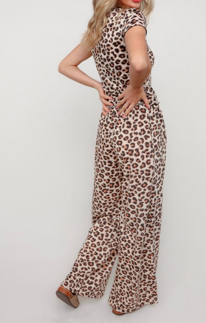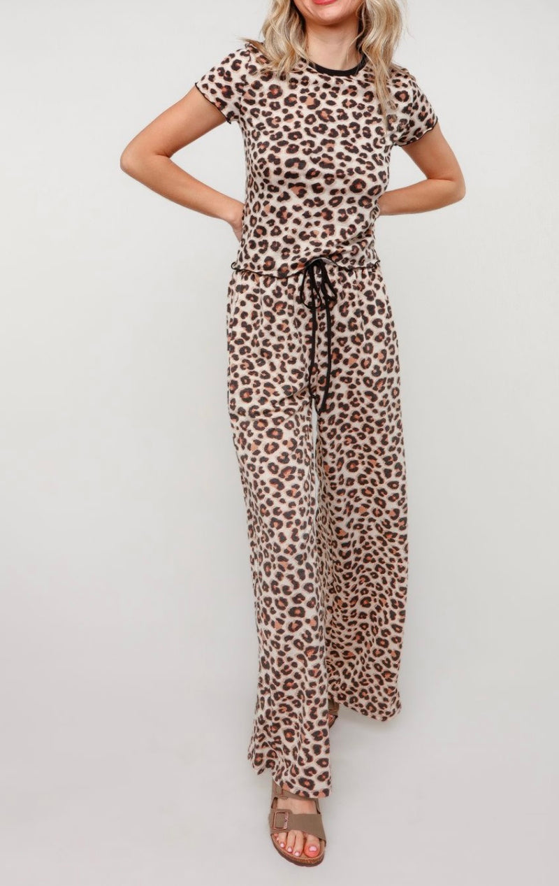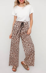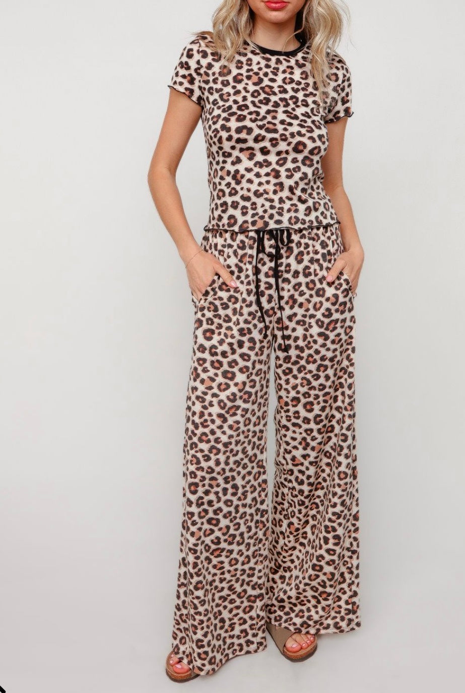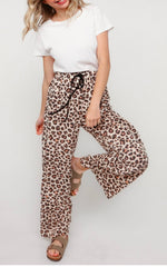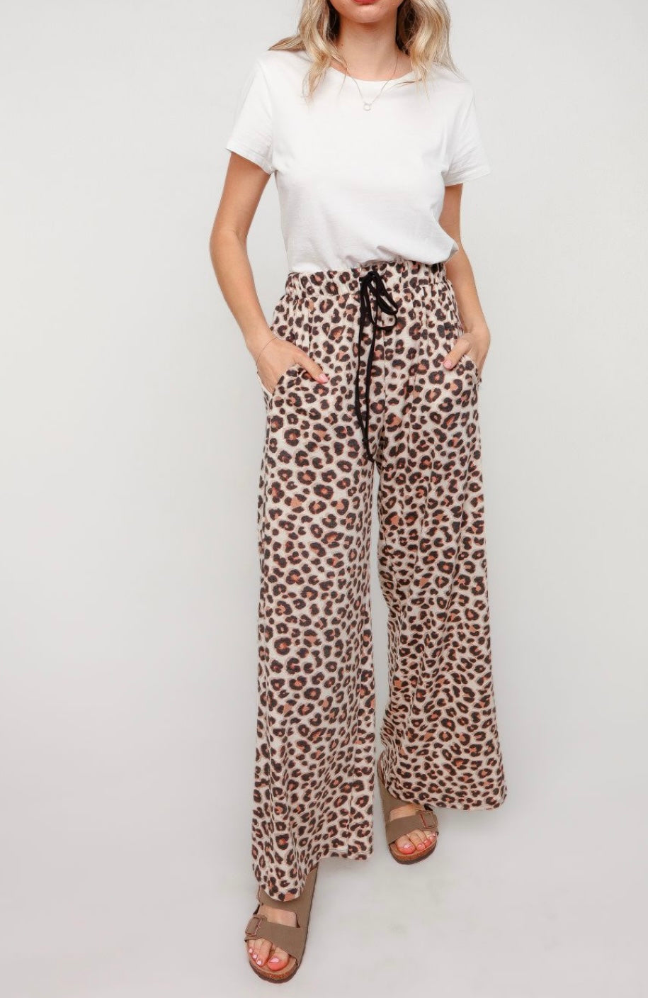 Easy leopard pants have an elastic waist with a decorative drawstring.  Fabric is soft, stretchy and has a comfortable ease.  Style these gorgeous pants with a black vest, tank or tee.  Perfect for travel.