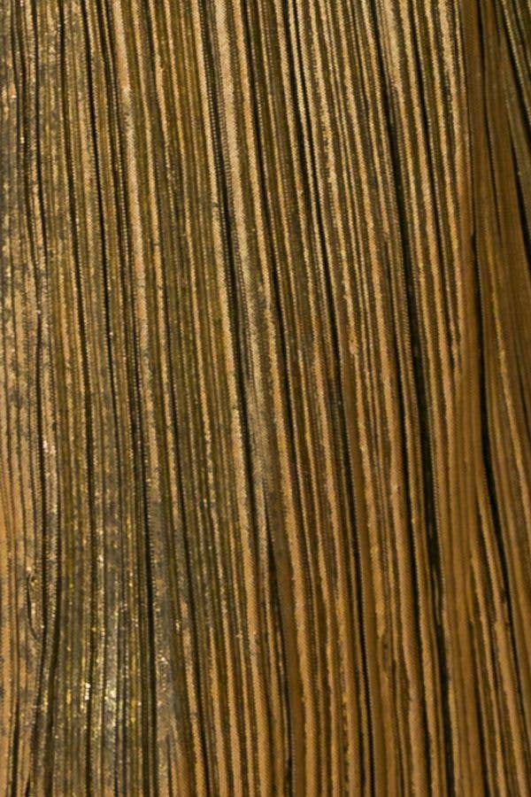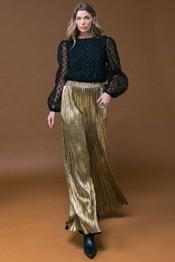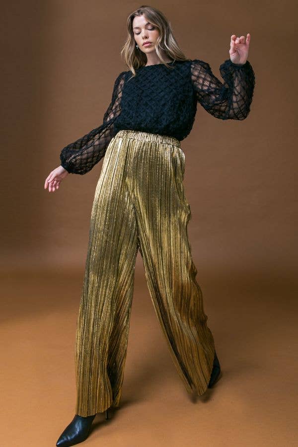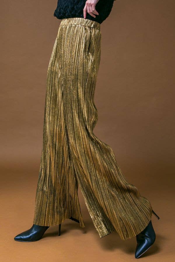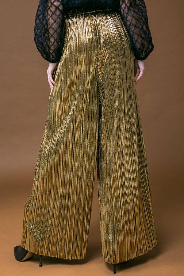 Gold woven pleated pant featuring elasticized waist and wide leg