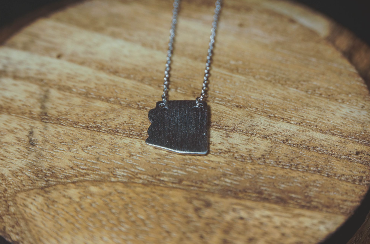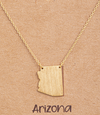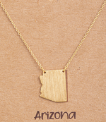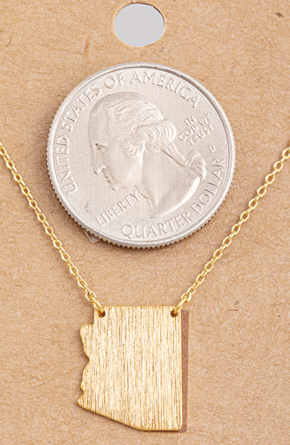 Show your state pride and embrace the spirit of the Southwest with our Arizona State Necklace.  This stunning piece pays homage to the enchanting state of Arizona, featuring a beautifully crafted pendant in the shape of the state.  Makes a great gift or souvenir of a trip to the desert. 16" long.  Comes in gold and silver.  Carry the beauty of Arizona with you wherever you go.