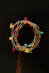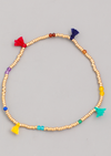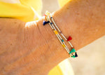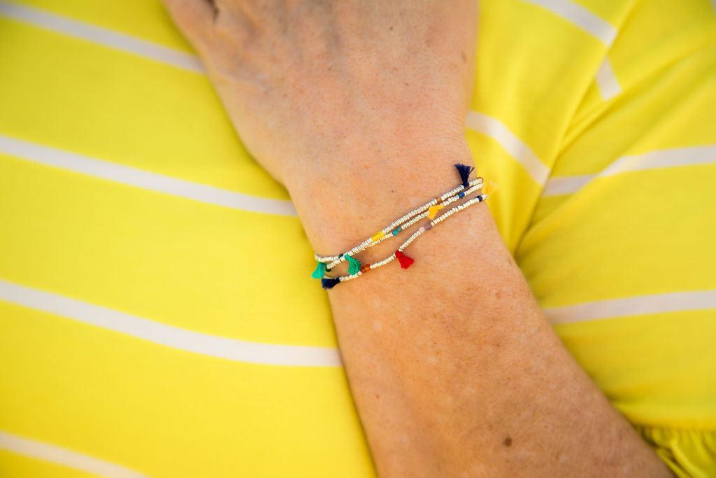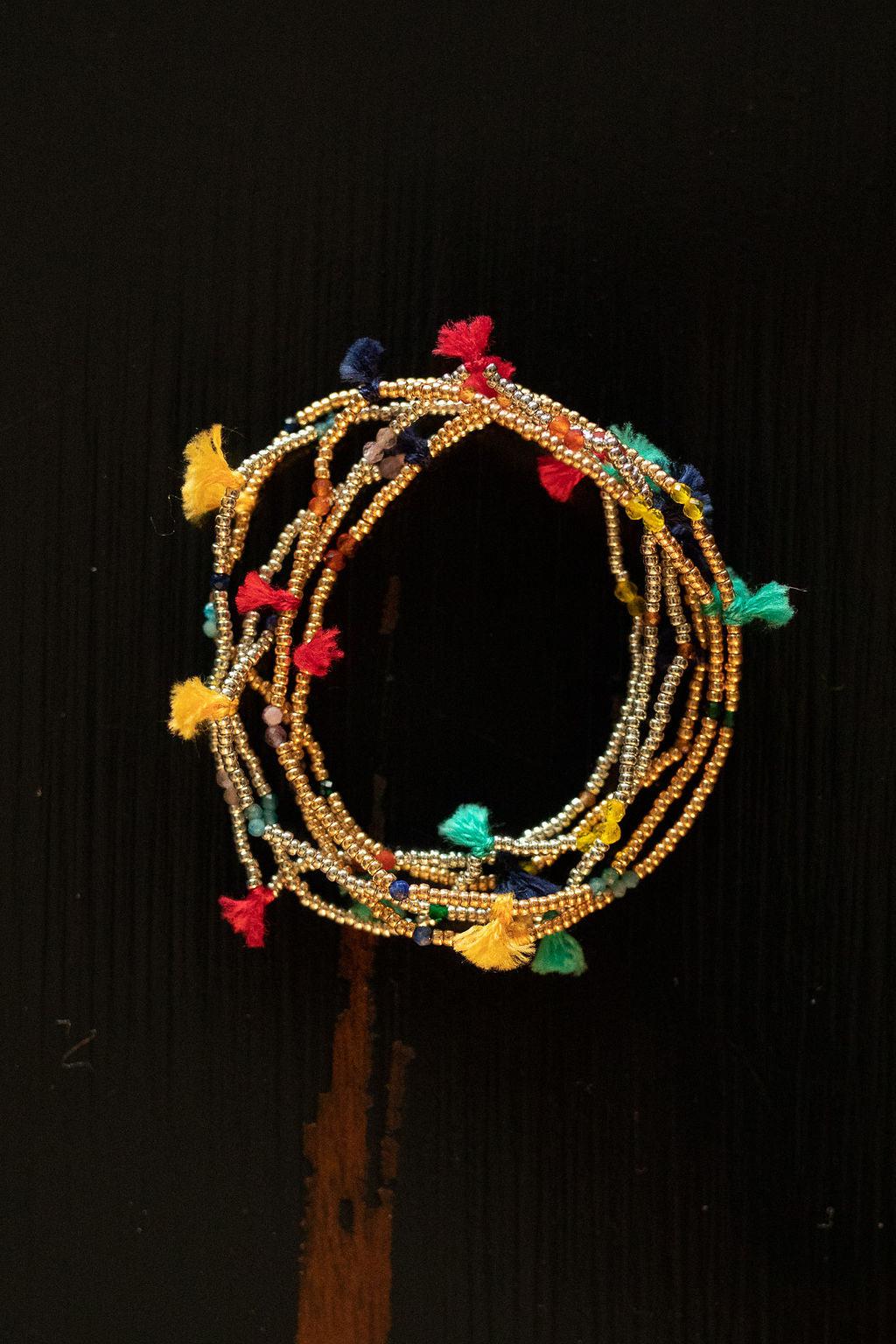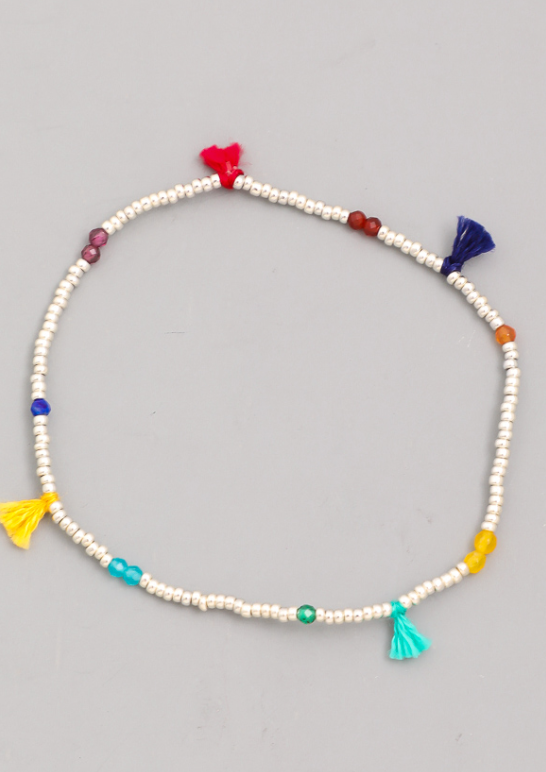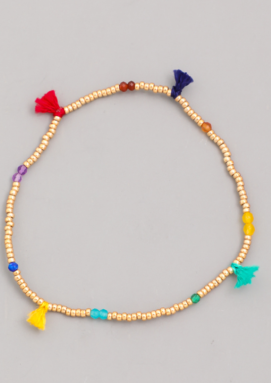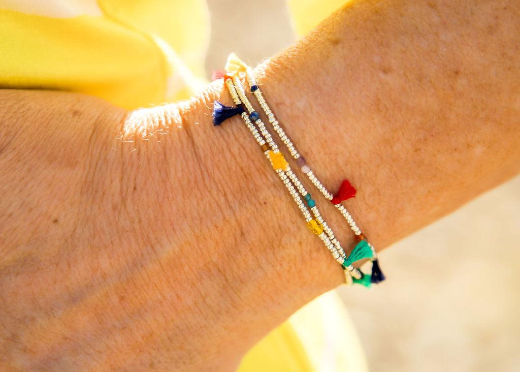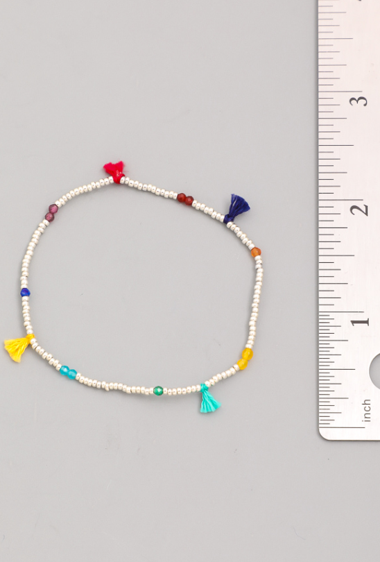 The cha cha bracelet is a tiny little stretch bracelet that's big on charm We love the tassels and the tiny colored beads. We think they look better layered. Available in gold or silver.