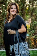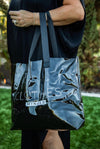 Introducing our Clothes Minded black PVC tote with nylon handle, a fashion forward accessory that's as stylish as it is practical.  Crafted from sleek and durable PVC material, this tote is built to withstand the demands of modern life while keeping you on-trend.  The contrast of the black tote with a sleek nylon handle adds a contemporary edge to your look, making it an ideal choice for those who appreciate both fashion and functionality.  On one side, you'll find a striking Clothes Minded graphic, which not only adds a touch of personality but also showcases your fashion forward attitude.  Whether you're headed to the office, running errands, or hitting the city for a day of shopping, this tote is your trusty companion.  It offers ample space for all your essentials and more, making it the perfect fusion of style and utility.  Elevate your everyday style and let your fashion sense shine with this black PVC Clothes Minded tote - because your choice in accessories should reflect your unique personality.  Tote is 18" across, 13.5" tall and has a 3" width of it's base.  The strap has an 11" drop, making it perfect to carry on your shoulder.