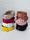 Belts in a monochromatic look. These belts are such a perfect element to finish off an outfit. In black, camel, blush pink, red, yellow, white and tan. The belt is 42” long, the holes to poke the tab into are each 1” apart. The smallest setting is at 29” and the largest is 40”. Belt is 1” wide. PU not genuine leather.