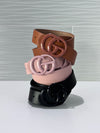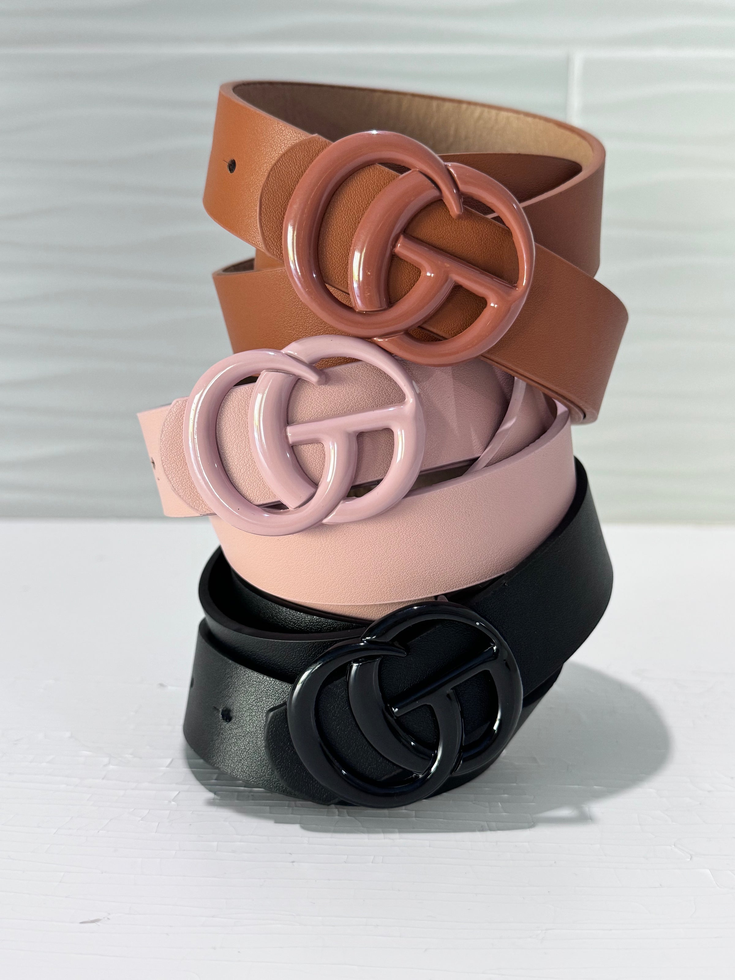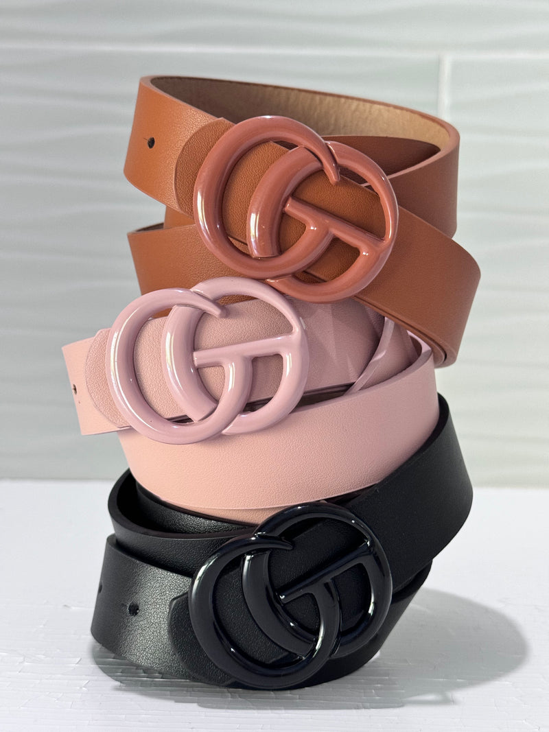 The tonal belt is a vegan leather belt with a buckle that coordinates with the belt.  These belts at a glance have an appearance of a famous designer brand.  Easy to get on and off.  One size fits all.  So many fabulous color options!